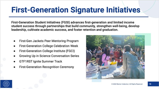 Key to this program's success was institutional adoption and Dr. Troy’s methods of using the program to amplify other first-generation signature initiatives on campus: including a speaker series and mentor professional development opportunities. Having the responsibility of recruiting, mentor training and matching facilitated by Mentor Collective, Dr. Troy was able to create more robust programming that allows her the time to interact with students and amplify program awareness.